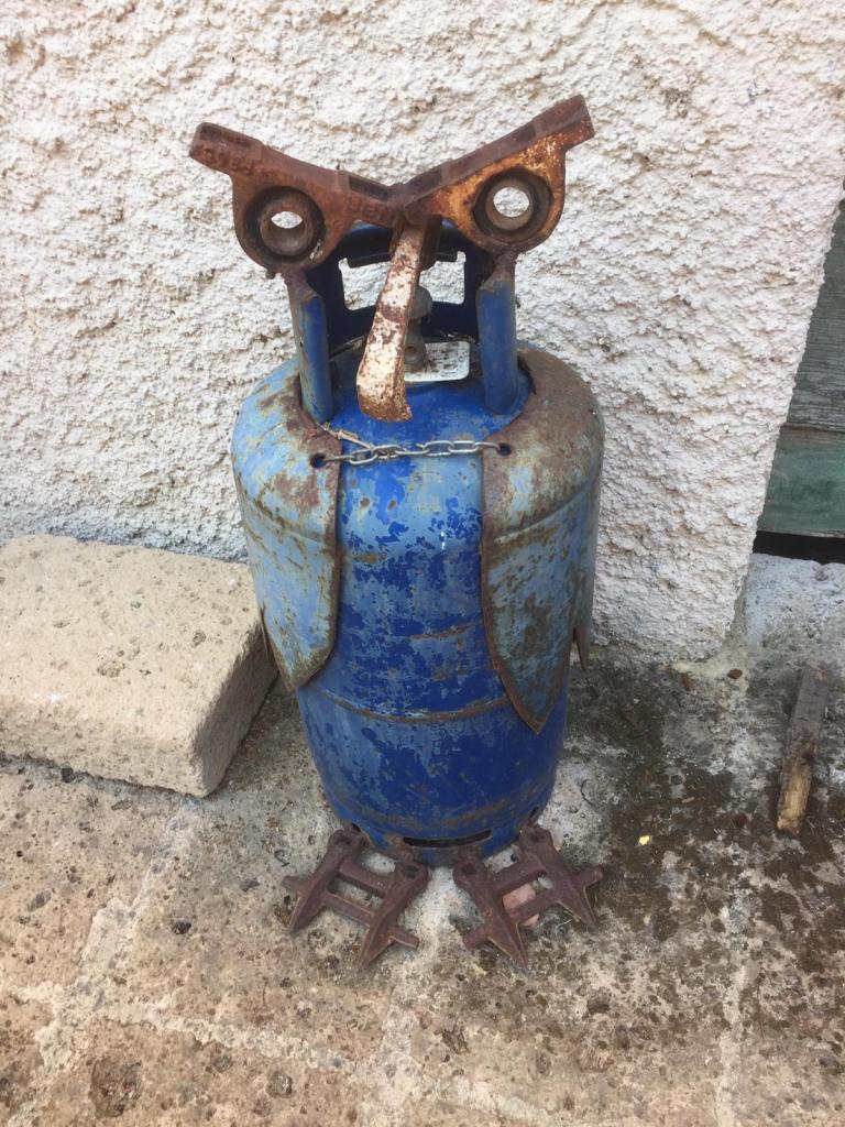 E questo è quanto per il surrealismo, ora due parole di presentazione e di scuse per la seconda foto della Mostra, intitolata “Prof. Gufo” (ricavato da due bombole del gas, una per il corpo e una per la mantellina da Batman* -e come si fa a tagliare e saldare le bombole del gas senza farle scoppiare? … beh diciamo che ci sono arrivato per via teorica, perché andare per tentativi non mi sembrava indicato); che è un gufo si vede dalle “sopracciglia”, e che è Prof si vede dall’aria accigliata. E’ accigliato per due motivi: