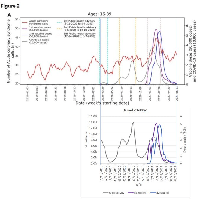 Siccome in ambulanza gli infermieri non chiedevano ai pazienti se erano vaccinati e da quando, o se avevano avuto sintomi di covid, gli autori usano modelli per stabilire una correlazione. Trovano un picco degli eventi cardiaci in tutto il paese dopo la prima vaccinazione, non dopo la seconda, più spesso nelle donne che negli uomini, e nessun aumento dovuto al covid.