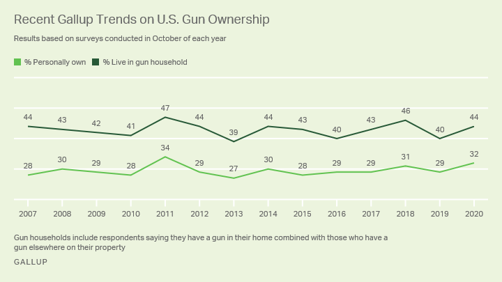 Dal 2015 in USA ci sono più armi che abitanti di ogni età. Stando al sondaggio Gallup del 2020, il 32% deteneva i 390 milioni di armi (stima) in circolazione nel paese e il 44% viveva in una casa dove c’erano armi: