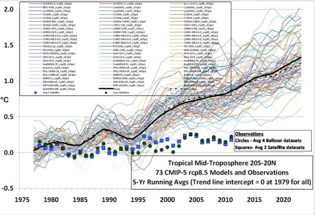 • Spaghetti previsionali dell’IPCC che dimostrano come le previsioni non coincidono con le misure effettive della temperatura misurate con i palloni stratosferici [sic] (i circoletti) e i satelliti (i quadrati).