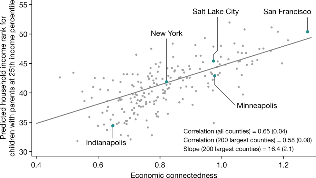 - Differenze di connettività economica possono spiegare relazioni ben note tra la mobilità verso un maggior reddito, la segregazione razziale, i tassi di povertà e le disuguaglianze.