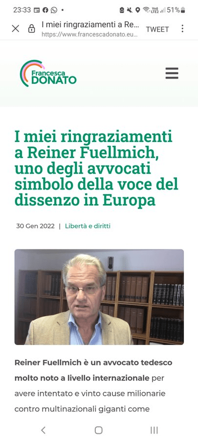 Tuttavia nuovi fondi ed esperti sarebbero arrivati con l’imminente vittoria dell’estrema destra in Italia. In primis del partito Rinascita Repubblicana rappresentato al Parlamento europeo dall‘avv. Francesca Donato, alleata del partito dell’estrema destra invasata fondato dal collega tedesco (nota 3) e sua ammiratrice. La rielezione del senatore Gianluigi Paragone era certa, con l’aiuto degli eletti di Alternativa per l’Italia Adinolfi-Di Stefano avrebbe senz’altro favorito l’incriminazione dei precedenti governanti italiani.