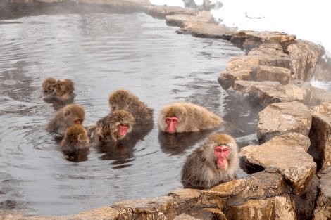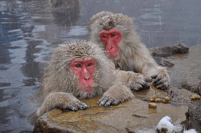 (Anche le macache che vanno alle terme con la prole hanno una gerarchia, e matriarche come fra gli scimpanzé.)