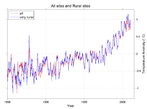 Nella realtà erano state misurate più di due secoli fa a Londra da Luke Howard che pubblicò i risultati in The Climate of London. Perciò i meteorologi ne tengono conto e ponderano le medie locali. Quanto all’oca e non addetti vari, hanno presente che le città coprono una superficie minuscola (0,3%) delle terre emerse e queste il 30% della superficie del pianeta. Perciò dubitano che in diluizione omeopatica il calore di dette isole riesca a influenzare la media globale.